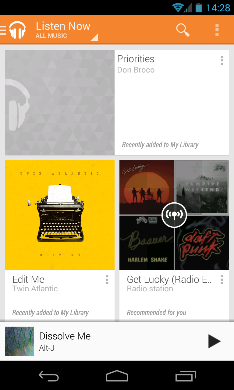 Plugging straight into the app on your Android device, the service turns your device into an all-containing jukebox. Songs and albums can be played on a one off basis or added to your library (or device offline) at the press of a button. The service is also available for use via Google’s web “app” on desktops and Chrome devices.